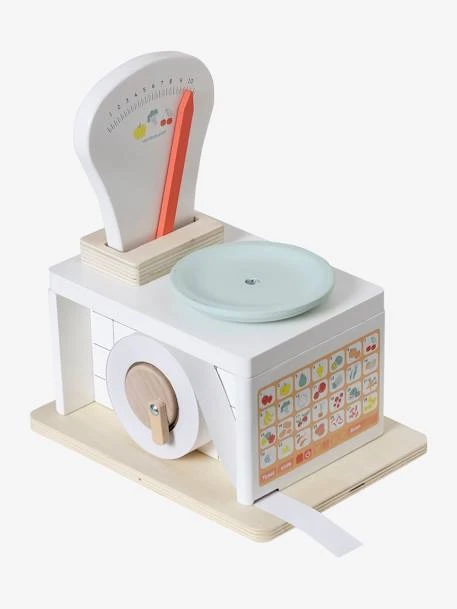 Emballez c’est pesé ! Cette balance en bois sera très utile à votre enfant quand il fera son petit marché. Comme en magasin, elle possède sur l’avant, les images des fruits et légumes à sélectionner pour la pesée. Lorsque l’on pose les fruits et légumes sur le plateau, l’aiguille bouge comme une vraie ! Enfin, le rouleau de papier permet de sortir le ticket.
