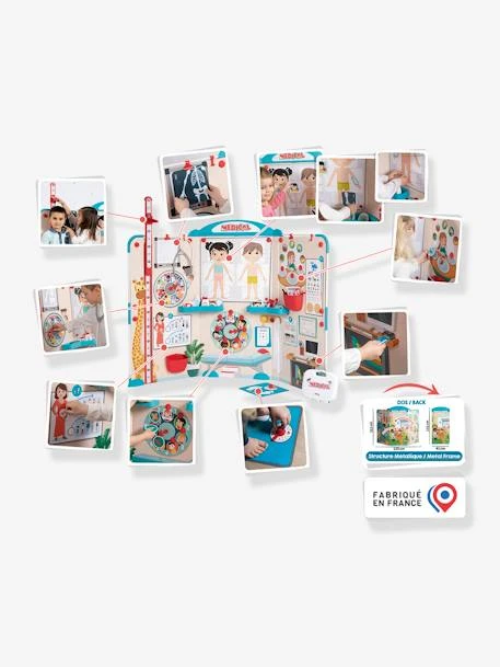 - De nombreuses fonctions liées à l’univers de la médecine sont reprises : coin radiologie, reconnaissance des parties du corps, partie nutrition, échelle optométrique, horloge des bobos, échelle de croissance, toise avec équerre jusqu’à 1m20, pèse-personne factice, horloge expliquant le déroulement d’une consultation, et bien d’autres encore…