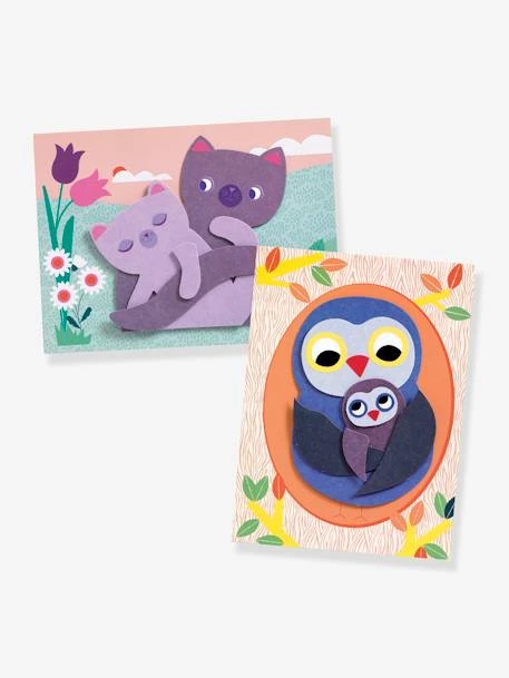 Une activité de collage pour réaliser 4 tableaux en relief. L’enfant assemble des papiers unis, colorés et épais. Il les colle sur les fonds illustrés et crée des scènes pleines de tendresse.