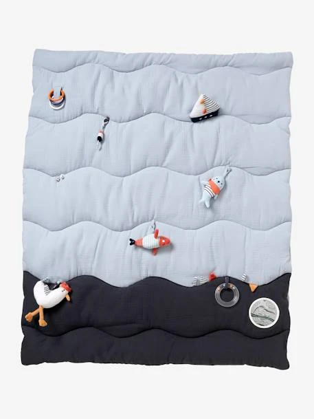 Bébé vogue vers de tendres découvertes avec ce tapis d’éveil en gaze de coton ! Il dispose de plusieurs jouets qui stimuleront les sens des petits : poisson pouet pouet, mouette à clochette, anneaux à billes… c’est parti pour de nouvelles aventures !